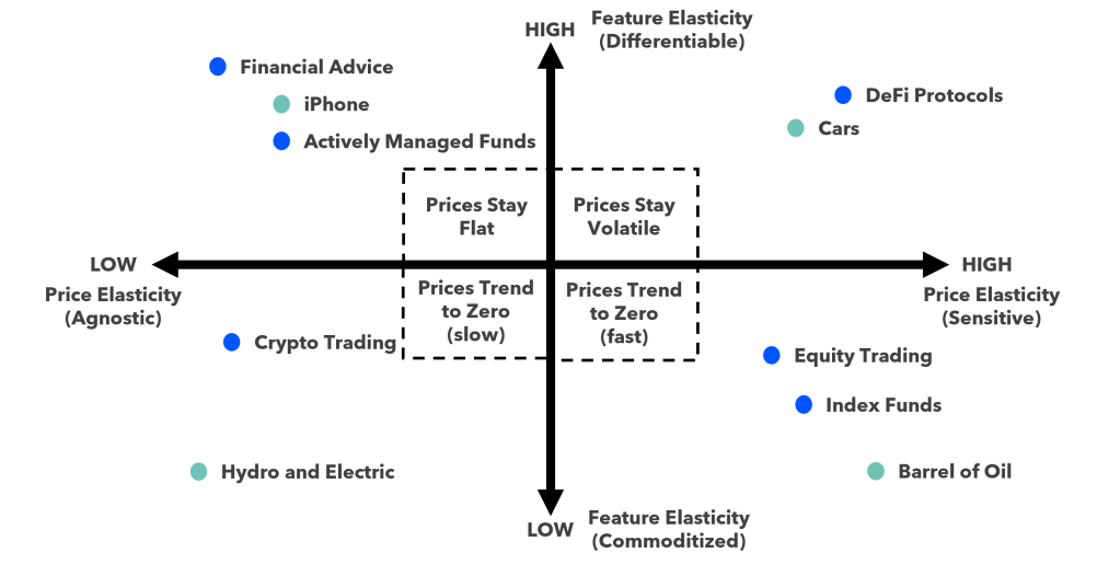 DeFi Ecosystem and Web3 Wallets: Finally, pointing out a rare upper right quadrant example, with high feature-elasticity and high-price elasticity, it is the DeFi ecosystem. DeFi is a pretty wide net to cast today, with many protocols still figuring out their pricing models. However, that is what makes the space so feature-elastic. There is a high degree of innovation, trial-and-error, and feature experimentation taking place. Layer on the added crypto characteristic of open-source and easily copied / forked code, and there is a recipe for high repetition feature releases. Because of this ‘easy copy’ trait of DeFi, most protocols must opt to stay cognizant of price competition—this is particularly the case because the current set of participants in the DeFi ecosystem today are likely relatively crypto-sophisticated and may be sensitive to the fees they pay.