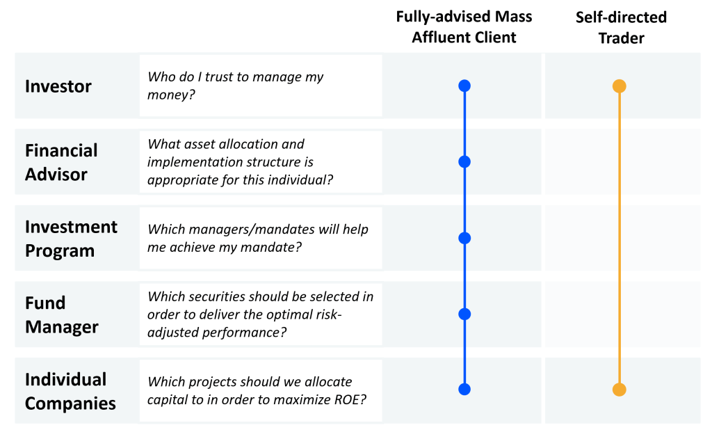 - Investor: What asset allocation is appropriate for me? What structure is most effective to implement the selected asset allocation (funds or direct security selection)? Which securities should be selected in order to deliver optimal risk-adjusted performance?