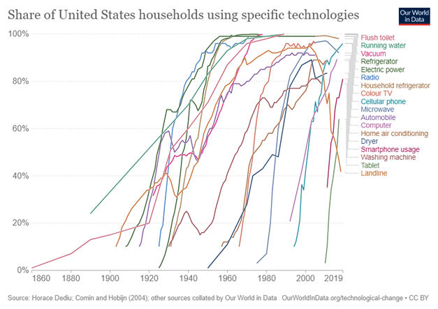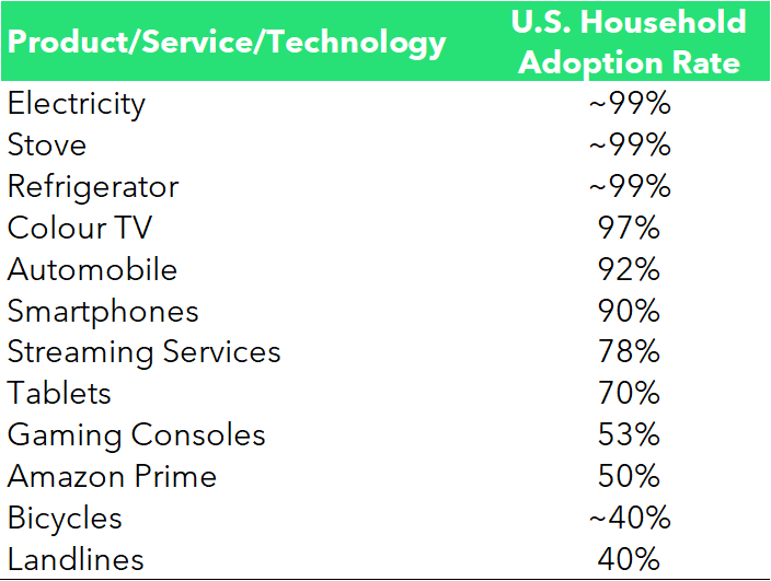 Some of these technologies will peak at ~100% adoption among households in developed markets. Others will not quite get there…