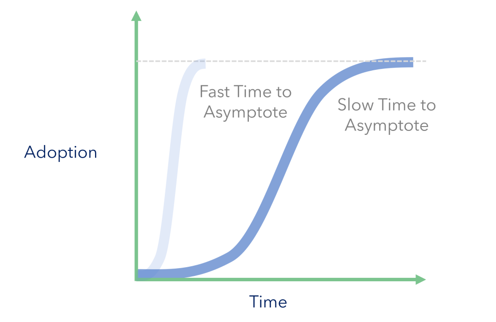 Defining time to asymptote is simple: it is the amount of time a technology, product, feature, or service takes to reach the inflection point in their adoption S-curve.