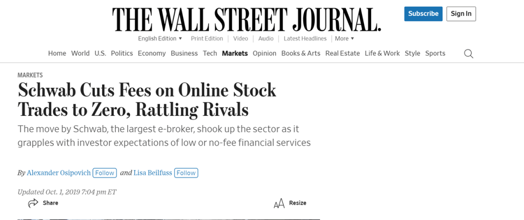 Seemingly out of nowhere, Schwab cut their trading commissions from $4.95 to $0, eliminating a major source of revenue from their income statement. With a heavily price sensitive customer base of traders, rivals E-Trade, Interactive Brokers and TD Ameritrade all dropped their commission fees in the weeks that followed.
